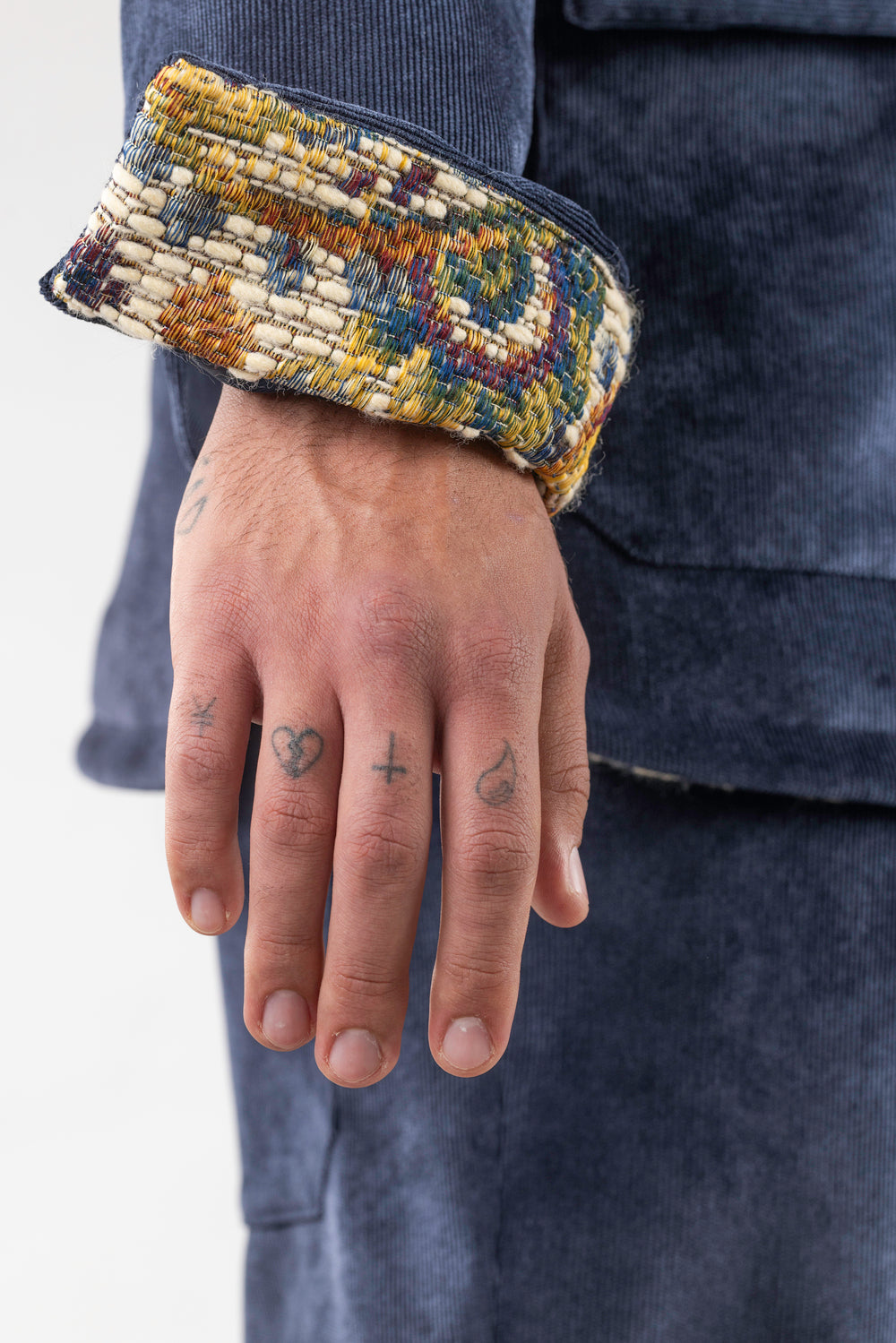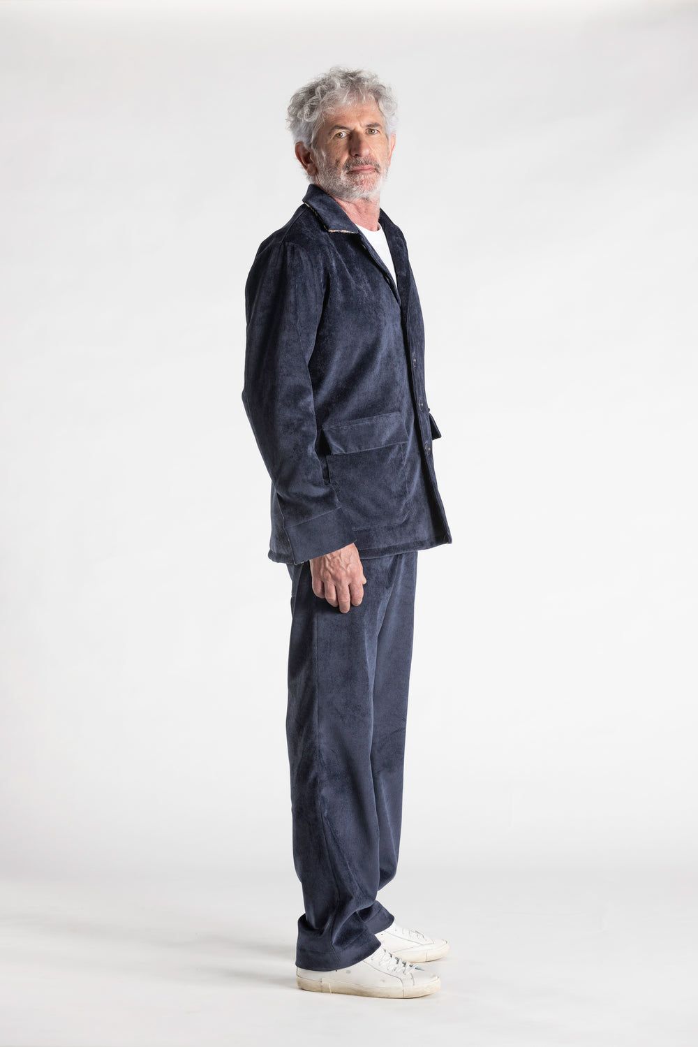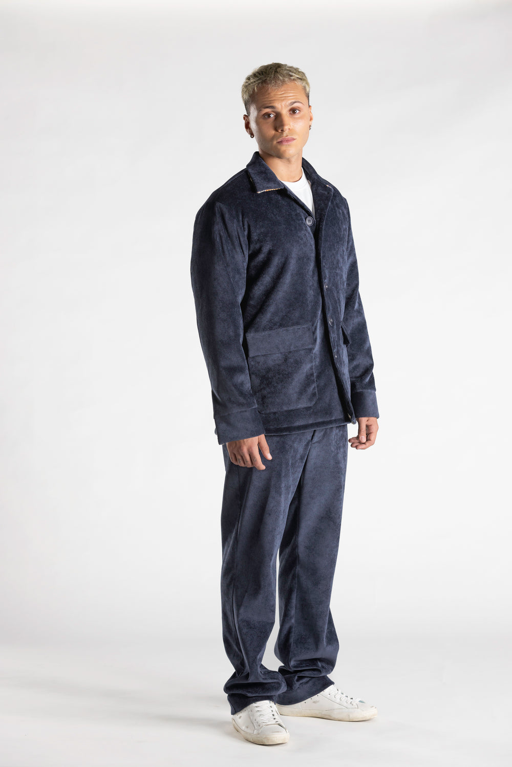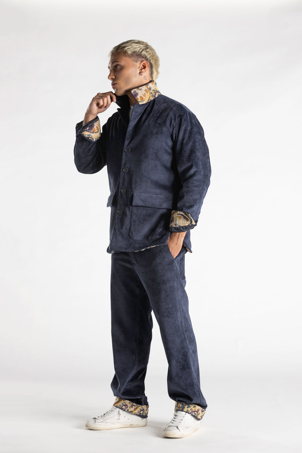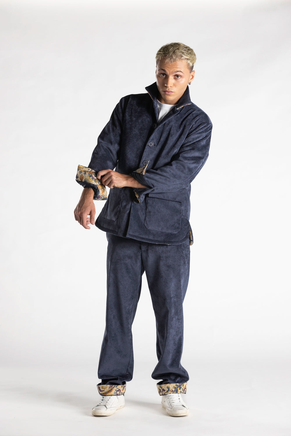 Questa giacca in velluto mille righe, interamente disegnata e realizzata in Italia,  foderata e imbottita, unisce comfort e stile in un design ricercato. Collo, polsi e orlo interno sono valorizzati da un contrasto in tessuto bandana, che dona un tocco di personalità e originalità. i bottoni so no realizzati in corozo chiamato anche avorio vegetale un materiale naturale ricavato dai semi della palma Tagua, originaria dell’America equatoriale, con la loro finitura naturale e sostenibile, completano il capo con un dettaglio autentico e raffinato, simbolo di artigianalità e attenzione ai materiali.